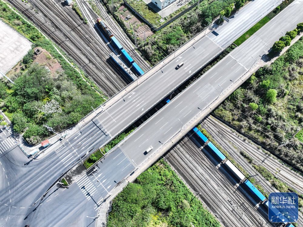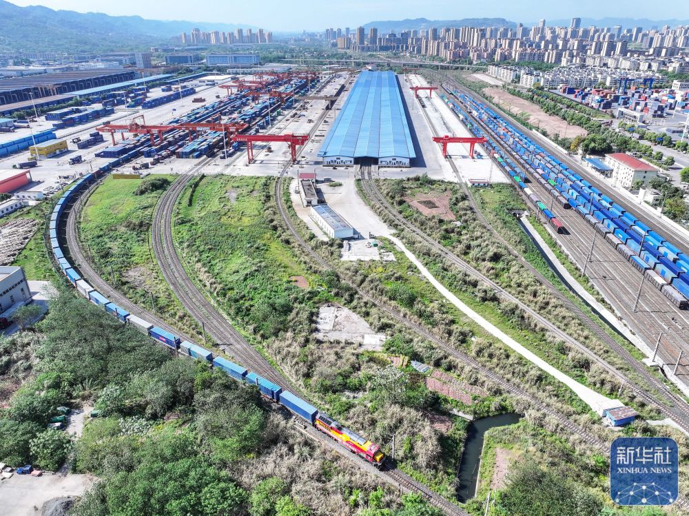 4月20日,圖定中亞班列在重慶團(tuán)結(jié)村中心站順利發(fā)車(無(wú)人機(jī)照片)。