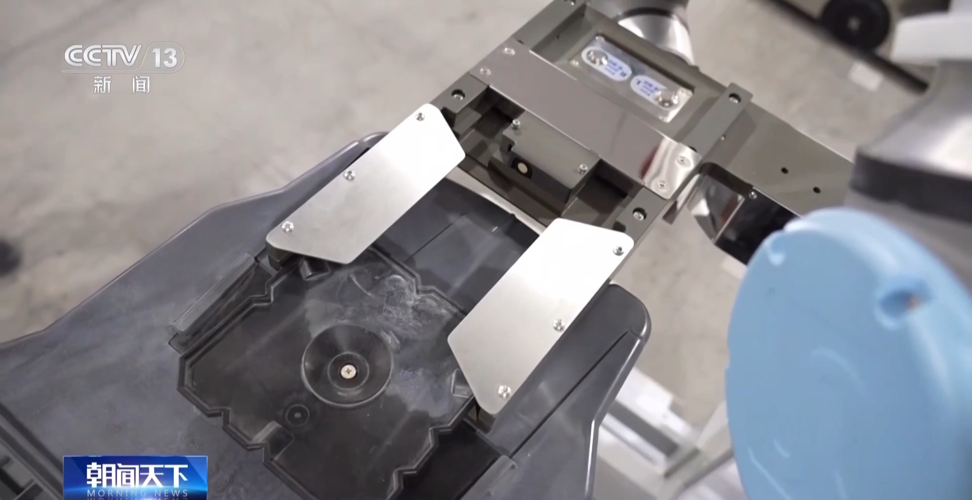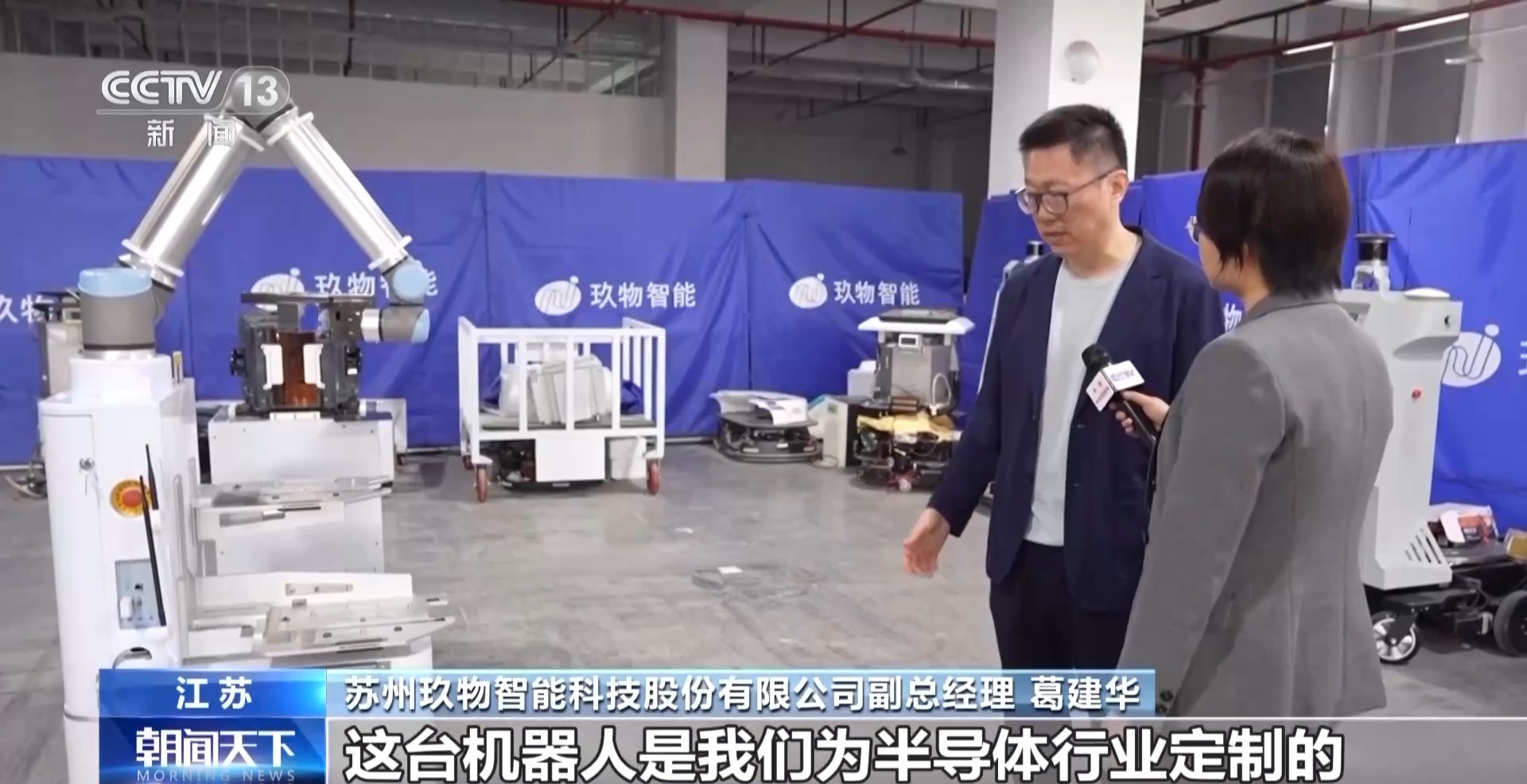 蘇州玖物智能科技股份有限公司副總經(jīng)理 葛建華:這臺機(jī)器人是我們?yōu)榘雽?dǎo)體行業(yè)定制的。我們現(xiàn)在抓取的這個設(shè)備,其實(shí)是一臺晶圓盒,這個晶圓片模型其實(shí)特別薄、特別脆,震動稍微厲害一點(diǎn)就會有裂痕,機(jī)械臂的精度可以達(dá)到0.1毫米。