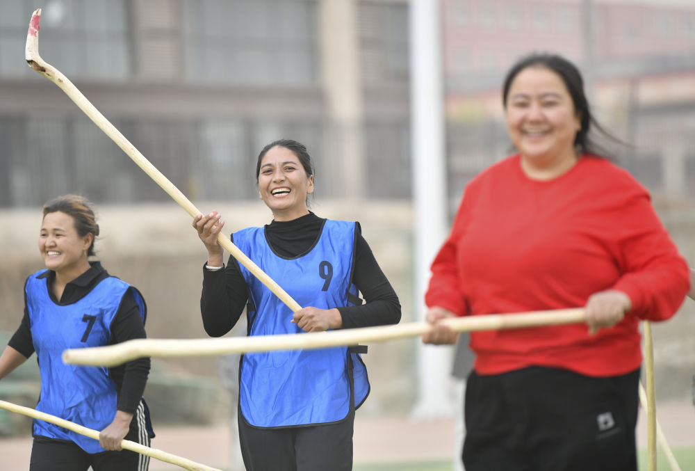 39歲的阿依古麗·買托合提是球隊里最年長的隊員。她身穿皮衣、腳踏休閑鞋,奔跑在正午驕陽下,屢屢揮動球桿,拼搶也毫不遜色。一起訓練的隊友有人穿著牛仔褲,有人穿著襯衫,還有人穿著后跟略高的鞋子。紅色的球洞穿由兩個塑料水瓶組成的球門,得分的一方歡呼不已,失球的隊員則懊惱地擦去臉上的沙塵。