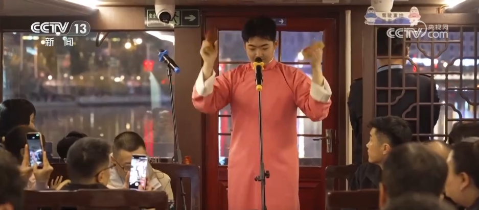 這段快板可不是在傳統(tǒng)的茶館里,而是在海河的游船上。這是最近在天津特別火的旅游項(xiàng)目,相聲主題游船特邀津門曲藝名家登船獻(xiàn)藝,將傳統(tǒng)相聲與海河風(fēng)光巧妙融合,游客在欣賞兩岸美景的同時,又可以感受曲藝的魅力,可謂一舉兩得。游客說:“在游船上聽相聲是不一樣的體驗(yàn),上了游船,站在甲板上,看著兩邊的霓虹燈光,特別愜意?!?/p>