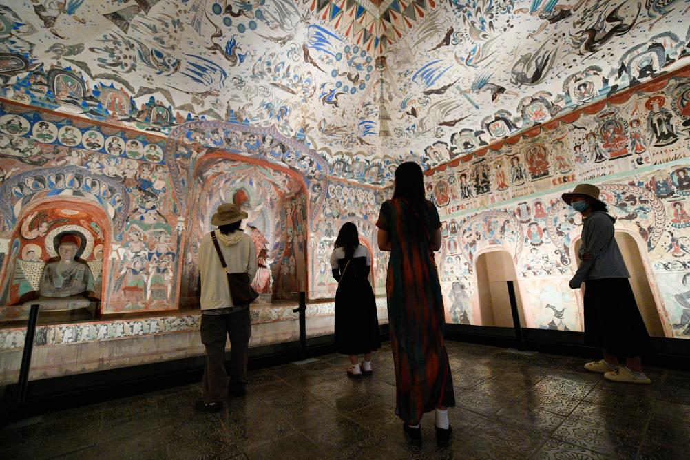 2024年6月7日,在敦煌石窟文物保護研究陳列中心,游客參觀莫高窟復制洞窟第276窟壁畫。 新華社記者 郎兵兵 攝