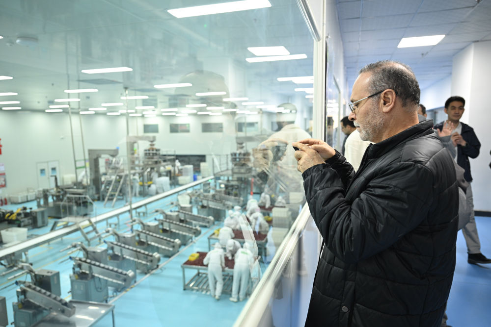 4月26日,外賓在參觀位于喀什的一家農(nóng)業(yè)科技有限公司時(shí)拍照記錄工廠生產(chǎn)線。新華社記者 辛悅衛(wèi) 攝