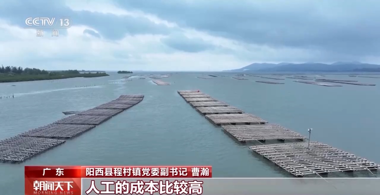 總臺央視記者 李嘯虎:在國家農(nóng)業(yè)產(chǎn)業(yè)強鎮(zhèn)廣東陽西程村鎮(zhèn),“五一”期間,這里的生蠔迎來大量上市。這片占地六萬多畝的生蠔養(yǎng)殖基地里,養(yǎng)殖戶正從水下收獲一排排成熟的生蠔,40多萬箱新捕撈的海鮮正從這里走上百姓的節(jié)日餐桌。