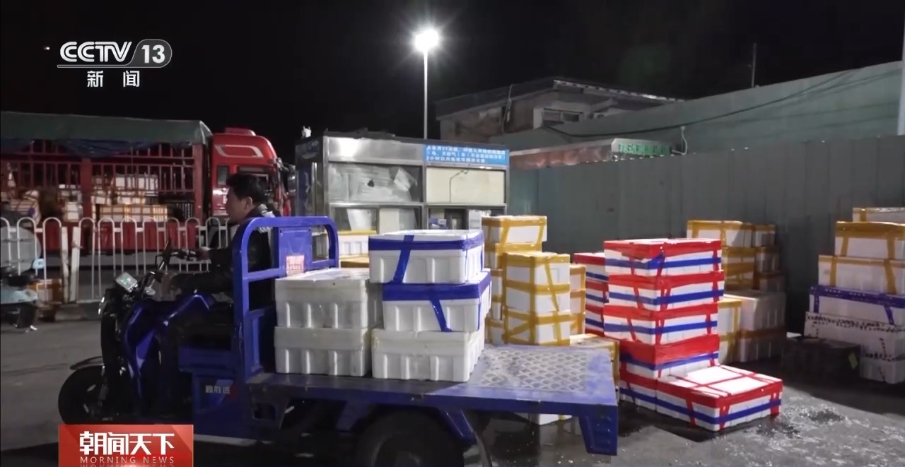 總臺央視記者 張琪:在北京大紅門京深海鮮批發(fā)市場,凌晨2點半,進場的車輛絡繹不絕,物流停車場也停滿了正在卸貨的貨車。