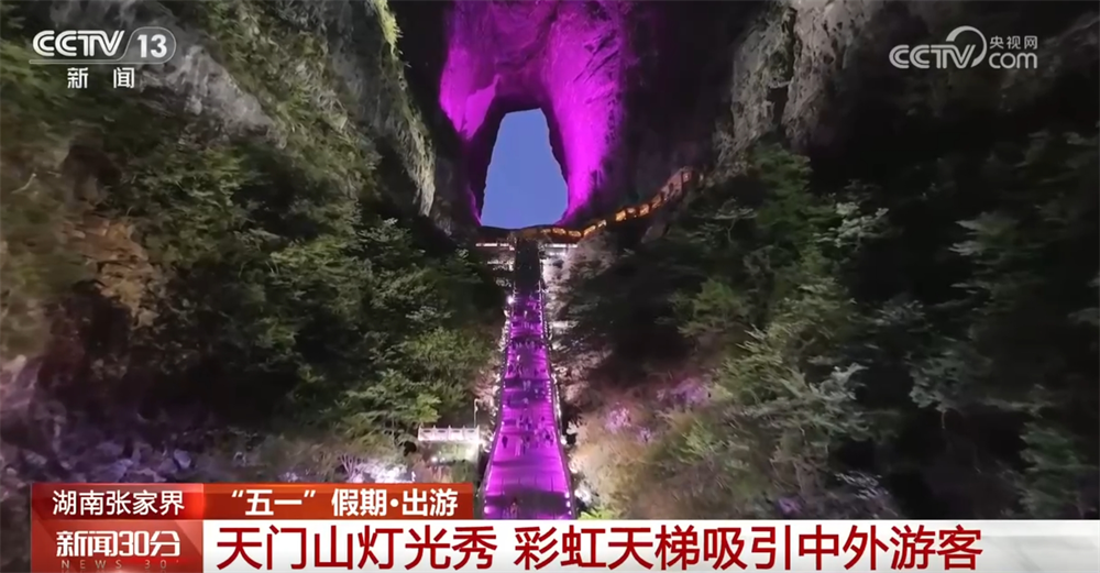 “五一”假期,湖南天門山景區(qū)以自然風(fēng)光吸引中外游客。隨著夜幕降臨,天門山山體被五彩燈光點(diǎn)亮,999級(jí)彩虹臺(tái)階燈光流轉(zhuǎn),遠(yuǎn)看就像一道連通天地的彩虹橋,將千年奇觀天門洞裝點(diǎn)得更加巍峨壯觀。