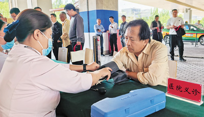 “您這血壓有點(diǎn)高,‘五一’假期活多,別忘了吃藥?!薄坝涀±玻x謝?!?1歲的司機(jī)楊建民在門口的義診攤位量完血壓,整理著衣袖。