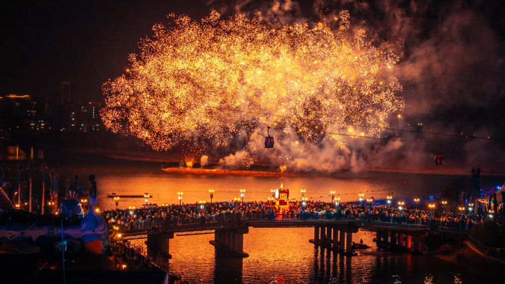 5月1日晚,游客在上海海昌海洋公園觀(guān)賞煙花秀。(上海海昌海洋公園供圖)