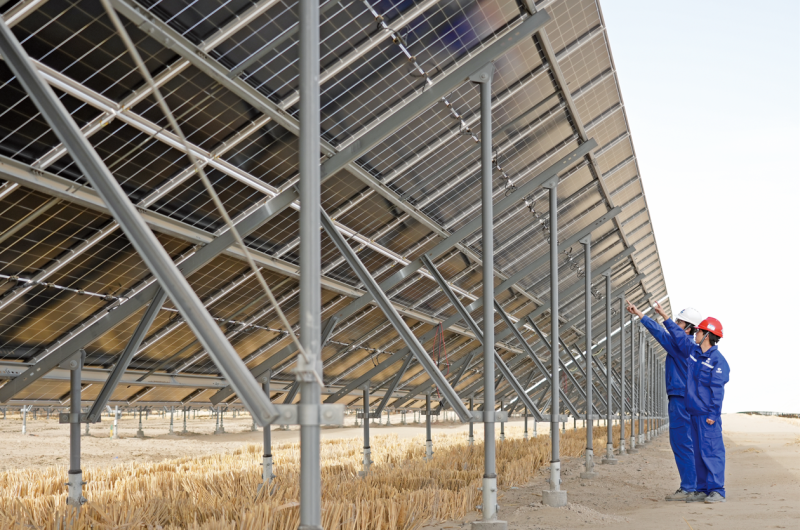 中電建沙雅縣25萬(wàn)千瓦光伏產(chǎn)業(yè)園區(qū)技術(shù)人員在檢查光伏板建設(shè)情況。朱曉飛/攝
