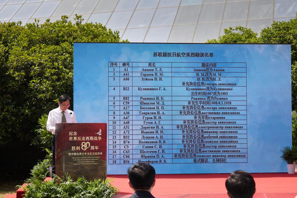 “我們期待與俄方相關(guān)部門(mén)、機(jī)構(gòu)和民間組織一道,尋找更多蘇聯(lián)籍抗日航空英烈史料,讓這些為了正義與和平而犧牲的年輕人的事跡,永遠(yuǎn)記載在歷史的豐碑上?!毖ι徴f(shuō)。