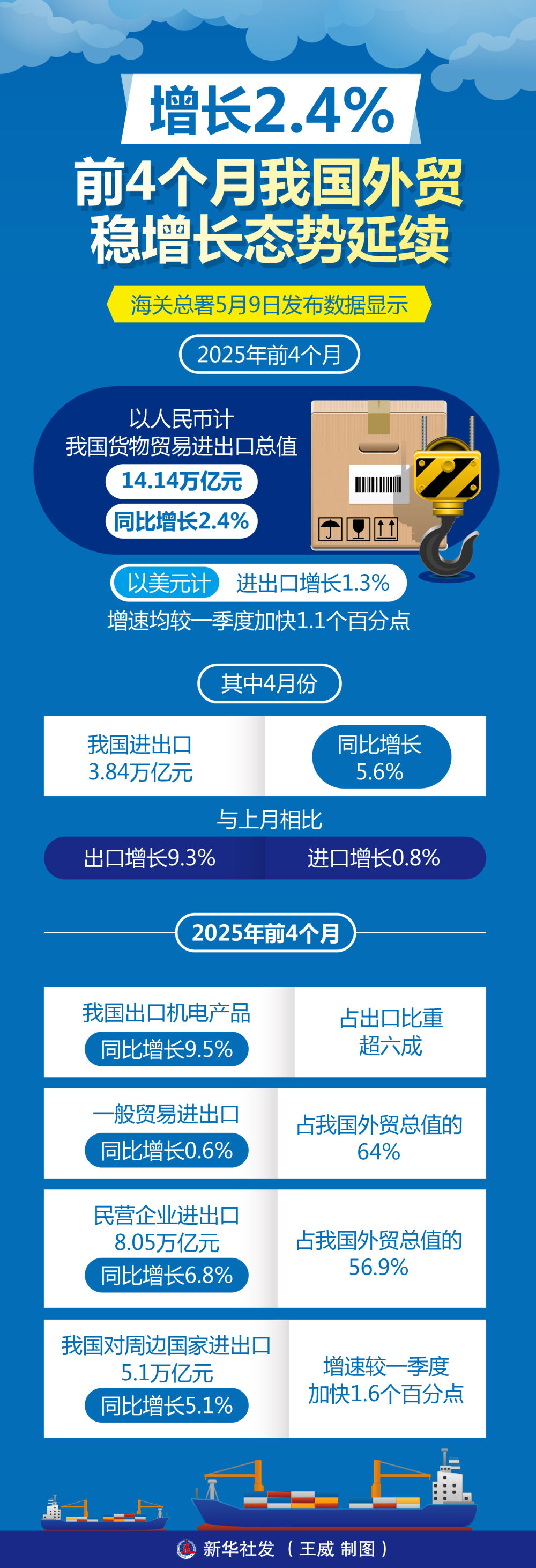 海關總署5月9日發(fā)布數據顯示,2025年前4個月,以人民幣計,我國貨物貿易進出口總值14.14萬億元,同比增長2.4%,以美元計,進出口增長1.3%,增速均較一季度加快1.1個百分點。其中4月份,我國進出口3.84萬億元,同比增長5.6%。與上月相比,雖出口同比增速高位小幅回落至9.3%,但進口由降轉為增長0.8%。
