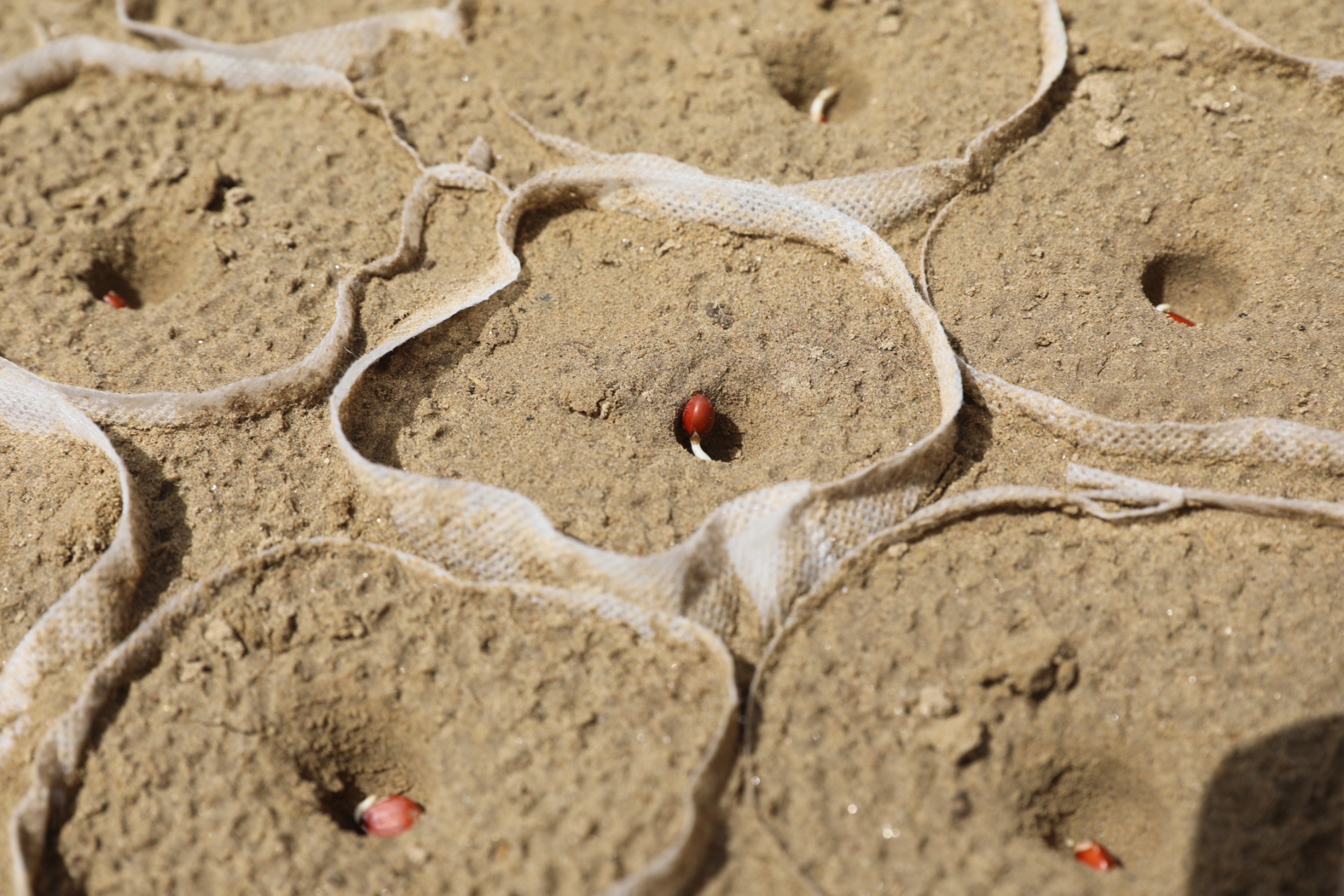播種前,土地經(jīng)過改良,混合化肥與羊糞的有機肥料被均勻撒入沙土,再裝入育苗袋。在育苗袋里播種后,工作人員澆水、埋土、覆膜、搭建拱棚,確保幼苗在防風保溫的環(huán)境中茁壯成長。