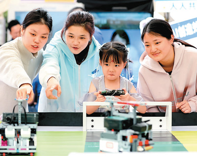 4月28日,在福建省福州市鼓樓區(qū)鼓東街道冶山春秋園,小朋友正在體驗足球機(jī)器人。謝貴明攝(人民視覺)