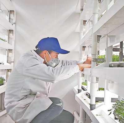 庫車市甬庫同心村智慧農(nóng)業(yè)植物工廠育苗室內(nèi),工作人員在仔細(xì)觀察幼苗。 王紅麗攝