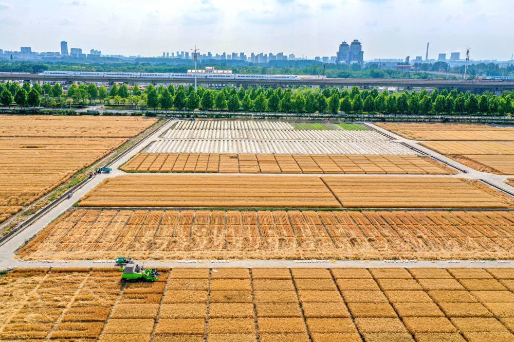 5月20日,在江蘇里下河地區(qū)農(nóng)科所(揚(yáng)州市農(nóng)科院)試驗(yàn)田,農(nóng)民駕駛收割機(jī)收割小麥(無(wú)人機(jī)照片)。新華社發(fā)(任飛攝)