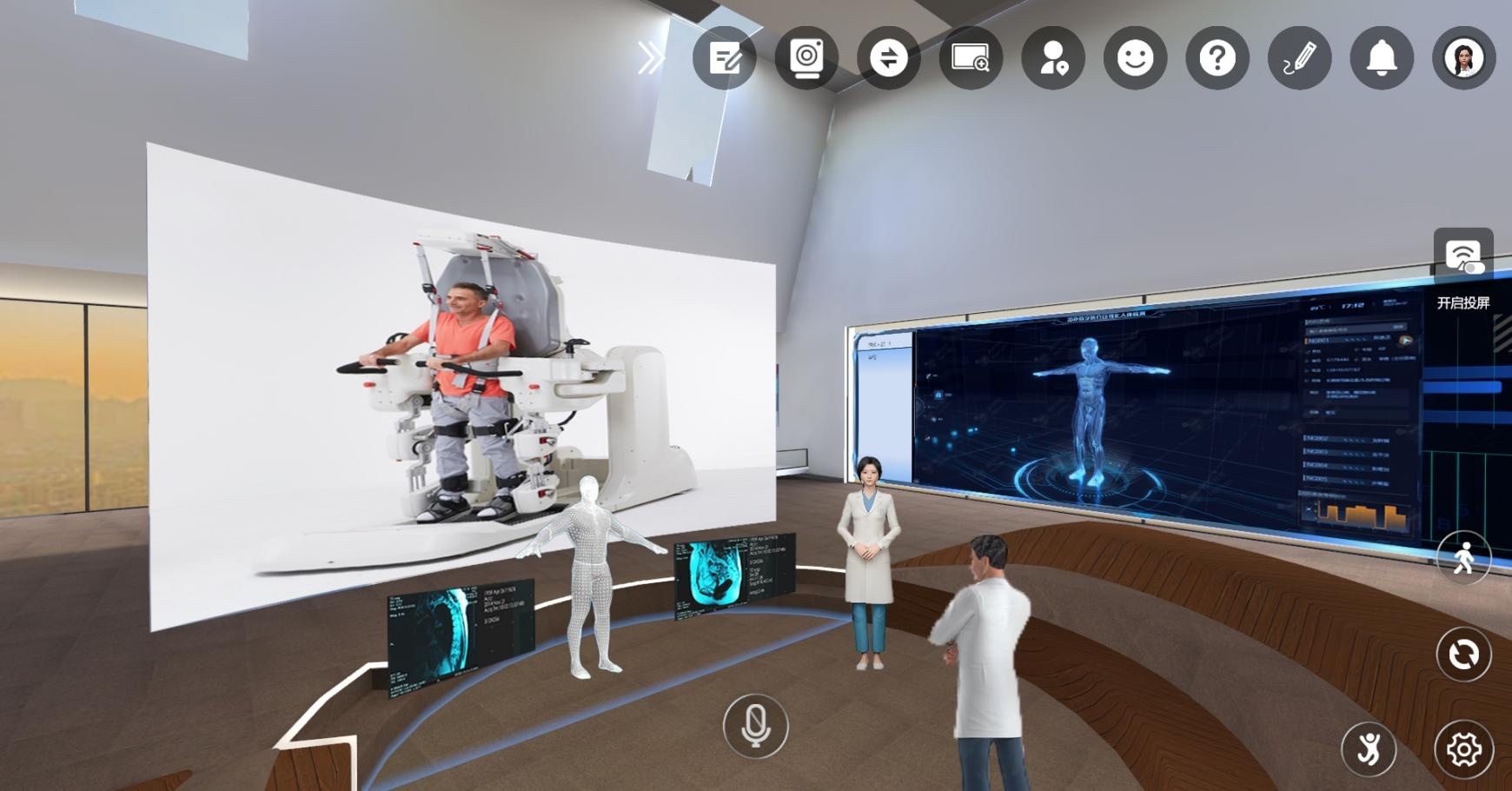 “就像推開一扇通往平行世界的門,這種‘在場(chǎng)感’是傳統(tǒng)遠(yuǎn)程協(xié)作難以企及的?!本S賽客首席運(yùn)營(yíng)官徐晨翔邊演示邊解釋道。他調(diào)出了VS·work中的“智聯(lián)康復(fù)元診療平臺(tái)”——這是維賽客在醫(yī)療元宇宙領(lǐng)域的創(chuàng)新應(yīng)用,集成了病情診療、康復(fù)訓(xùn)練、社交培訓(xùn)等功能。在虛擬界面中,醫(yī)生可以通過高精度空間定位系統(tǒng)“走進(jìn)”患者的虛擬診療室,患者則通過可穿戴設(shè)備完成肌力評(píng)估、平衡訓(xùn)練等動(dòng)作,數(shù)據(jù)實(shí)時(shí)反饋至醫(yī)生終端,為偏遠(yuǎn)地區(qū)的患者提供了更加便捷、高效的診療服務(wù)。