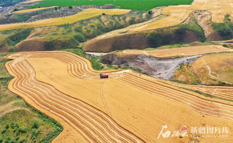 2024年6月24日,在新源縣則克臺鎮(zhèn)則克臺村的麥田里,隨著大型收割機(jī)駛過,麥穗、秸稈有序分離,一顆顆麥粒從收割機(jī)出料口傾瀉而下,裝進(jìn)運(yùn)糧車?yán)?。張文庭攝