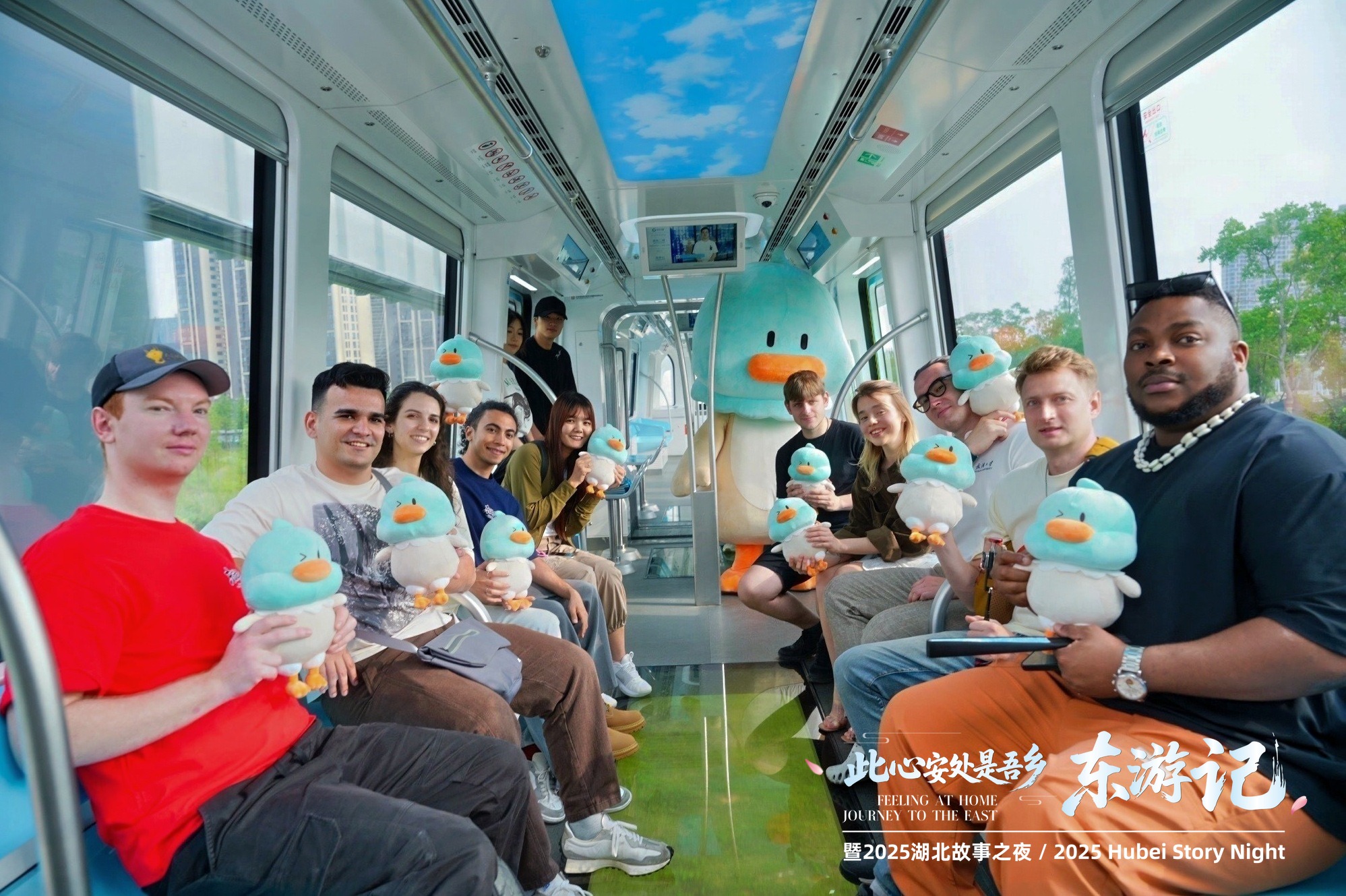 武漢新晉網(wǎng)紅打卡地怎么少得了光谷空軌,在吉祥物青青鴨的帶領(lǐng)下,體驗(yàn)官們踏上了空中交通之旅。270°全景視窗將城市天際線變成流動畫卷,無人駕駛系統(tǒng)在空中穿行如科幻大片。這種新奇的乘車體驗(yàn)引得大家連連贊嘆,俄羅斯留學(xué)生可欣興奮的說,“我感覺自己飛起來了,像鳥一樣飄在空中?!?/p>