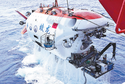 “蛟龍”號在西太平洋海域完成下潛出水。新華社記者 王聿昊攝