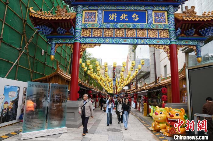 下午3點(diǎn)多,臺(tái)北街上已聚集不少食客,大腸包小腸、咸酥雞、旗魚(yú)黑輪、愛(ài)玉冰等美食琳瑯滿(mǎn)目。放眼望去,融合滇西古建筑特色的牌坊、源于閩南古厝的攤車(chē)商亭、來(lái)自臺(tái)中黃永阜老人的眷村彩繪,讓兩岸同根同源的文脈在此交匯。
