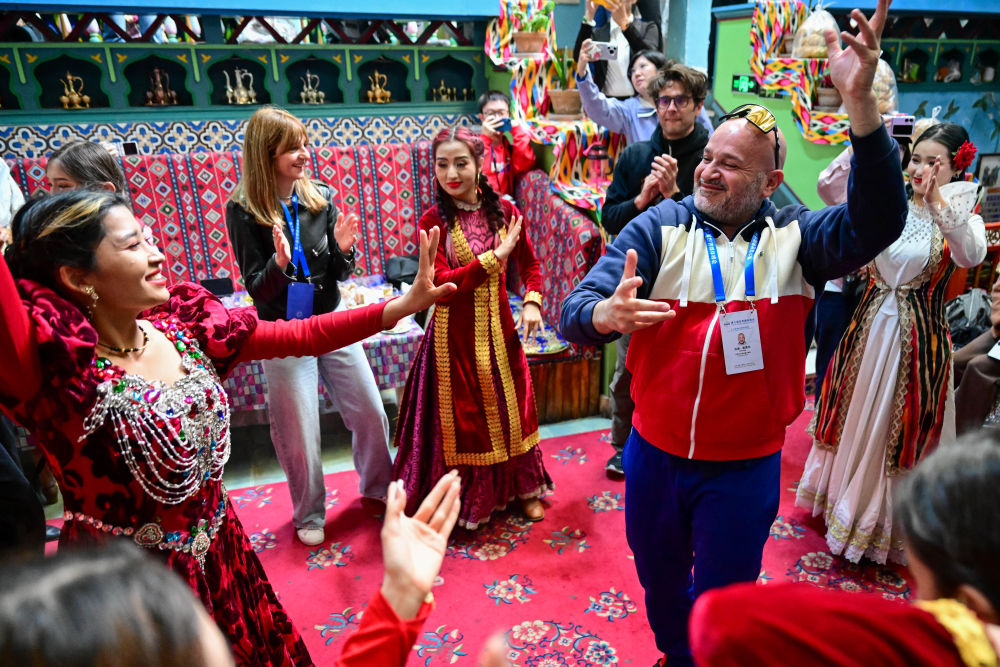 在新疆喀什古城景區(qū)“古麗的家”旅游家訪點,第六屆世界媒體峰會的與會嘉賓和當(dāng)?shù)鼐用褚黄鹞璧福?024年10月16日攝)。新華社記者 丁磊 攝