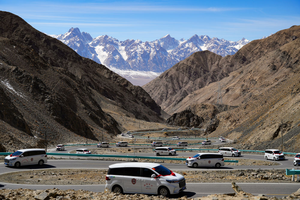 在新疆塔什庫爾干塔吉克自治縣,參加“盤龍古道”恢復(fù)通車儀式的車隊在行進中(2025年3月22日攝)。新華社記者 徐宏巖 攝