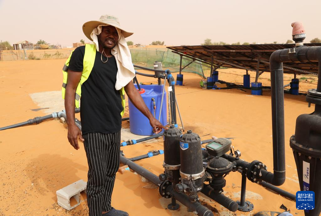 5月22日,在毛里塔尼亞西部特拉扎區(qū)比爾·巴爾卡村,中非綠色技術(shù)公園園區(qū)灌溉技術(shù)工人穆罕默德·伊塞勒穆介紹園區(qū)智能灌溉設備。新華社記者 司源 攝