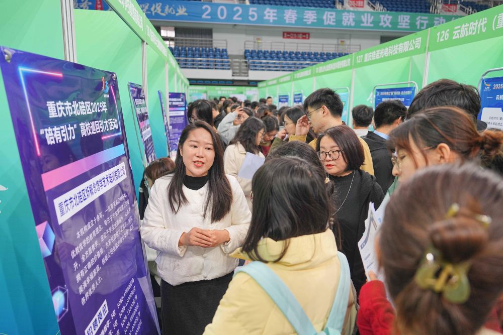 3月28日,西南大學(xué)應(yīng)屆畢業(yè)生在2025年春季促就業(yè)攻堅(jiān)行動(dòng)綜合類雙選會(huì)現(xiàn)場(chǎng)了解崗位信息。活動(dòng)邀請(qǐng)裝備制造、新能源、數(shù)字信息、綠色化工、基礎(chǔ)教育、醫(yī)療衛(wèi)生等行業(yè)領(lǐng)域企業(yè)參與,為畢業(yè)生搭建廣闊多元的就業(yè)平臺(tái)。新華社發(fā)(秦廷富攝)