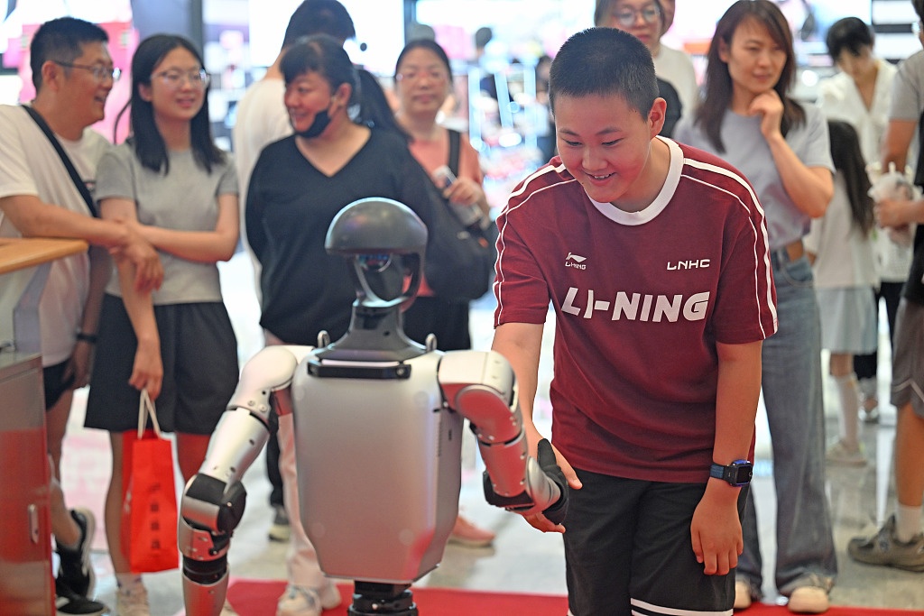 2025年5月2日,湖北宜昌的消費者與人形機器人進(jìn)行互動。