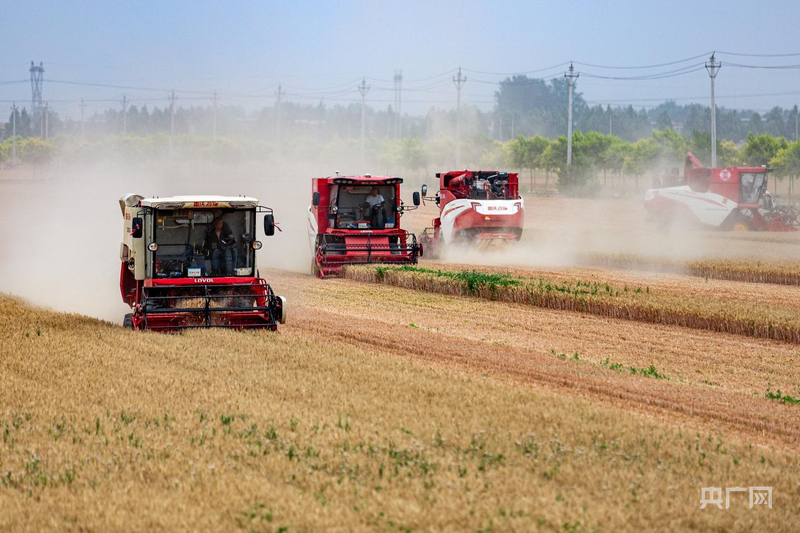 種糧大戶張洪文的4臺聯(lián)合收割機開足馬力馳騁在麥田里(央廣網發(fā) 王建安 攝)