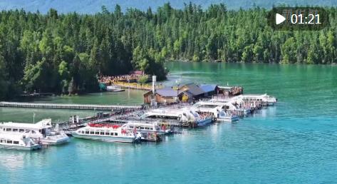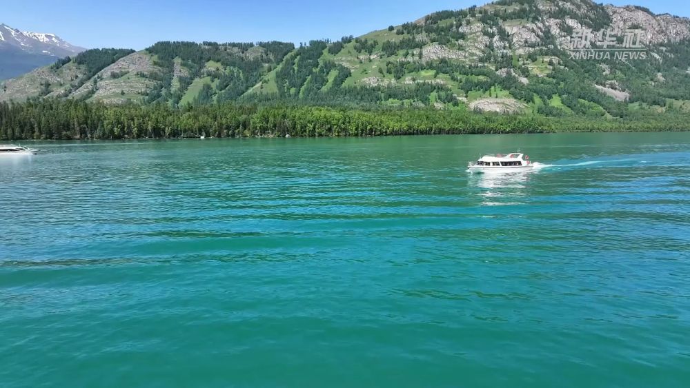 在碧波蕩漾的新疆喀納斯湖里,一艘艘全電觀光游船正載著游客欣賞著這里獨特的湖光山色。