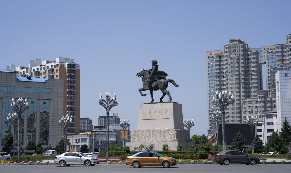 驅(qū)車駛?cè)牒邶埥∩兄臼?,一眼便看見環(huán)島中心屹然挺立的高大銅像:趙尚志將軍身騎戰(zhàn)馬,戎裝飛揚,他望向遠方,好似凝視這一方和平安寧。