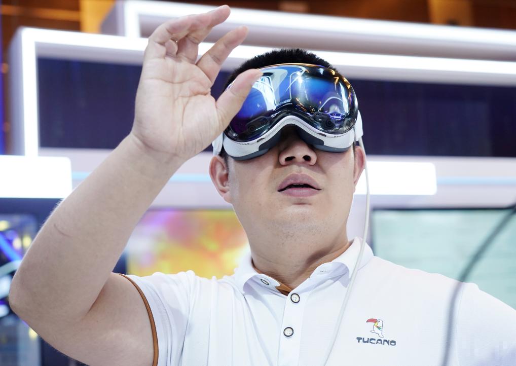 7月2日,參觀者在2025全球數(shù)字經濟大會數(shù)字經濟國際交流合作體驗區(qū)體驗一款MR混合現(xiàn)實設備。新華社記者 張晨霖 攝