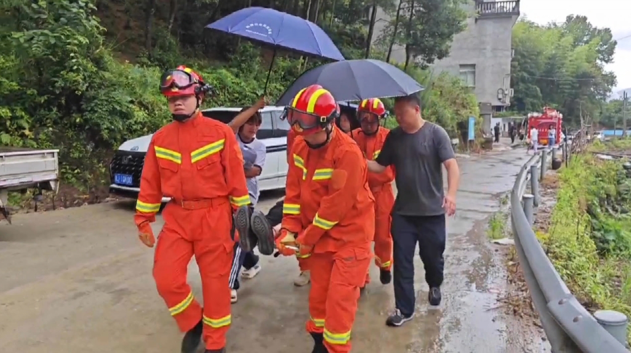 在臺州黃巖嶼頭鄉(xiāng),轉(zhuǎn)移小組在排查中發(fā)現(xiàn)上鳳村一處地質(zhì)災(zāi)害隱患點居住著一位92歲老人,大家立即取來擔(dān)架將老人慢慢抬出。在大家冒雨接力下,老人被護(hù)送至安置點。