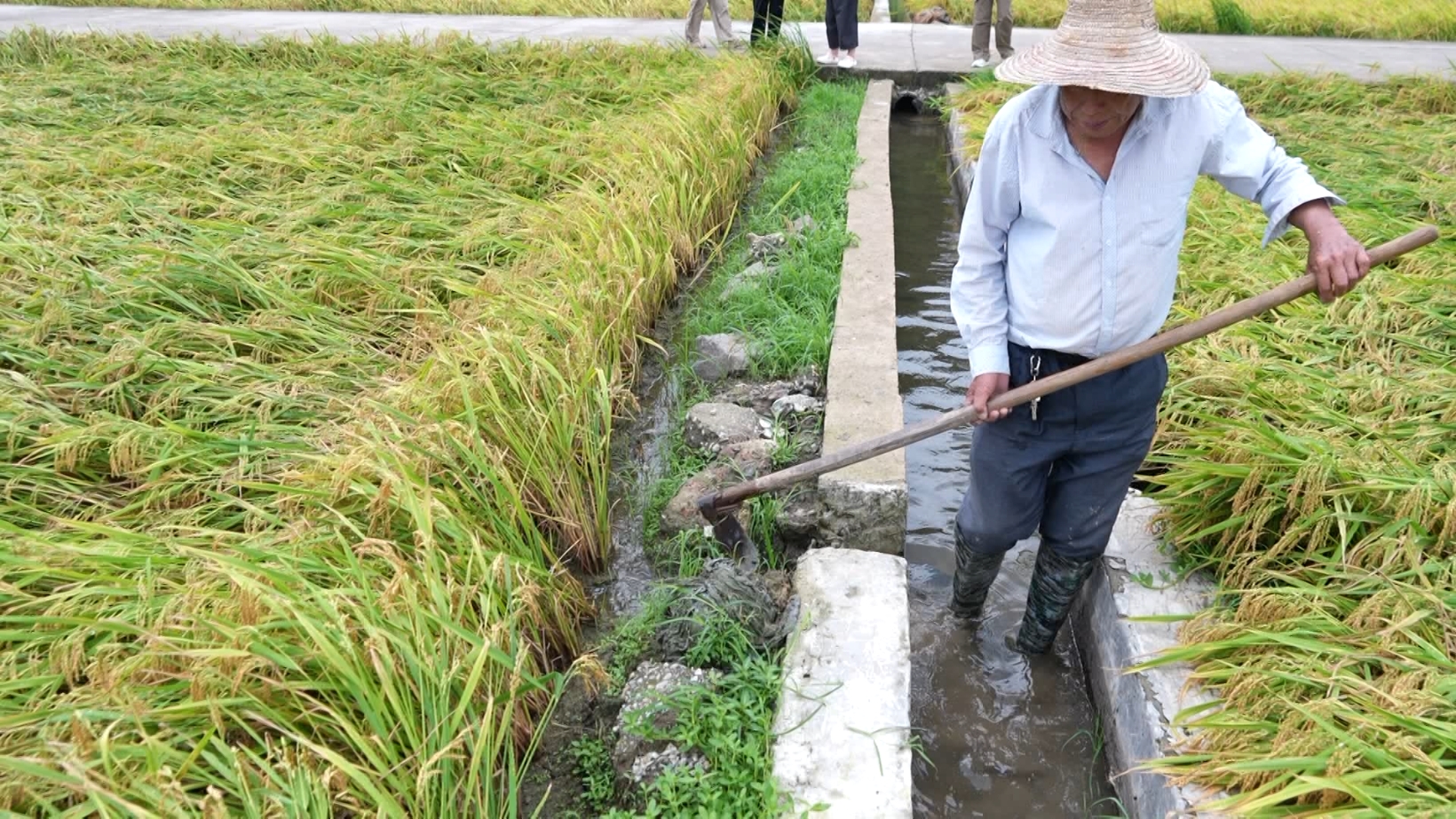 因為合作社的水稻田還處于抽穗灌漿期,因此田里還需留一部分水,有利于水稻后期生長。按照農(nóng)技干部的指導(dǎo),合作社負(fù)責(zé)人和工人將水稻田的積水排出大部分,接下來等天氣晴好,他們就會對倒伏的水稻及時采取捆綁扶正措施,盡量減少在高溫高濕氣候條件下水稻接觸積水會出現(xiàn)發(fā)芽、品質(zhì)降低的情況。