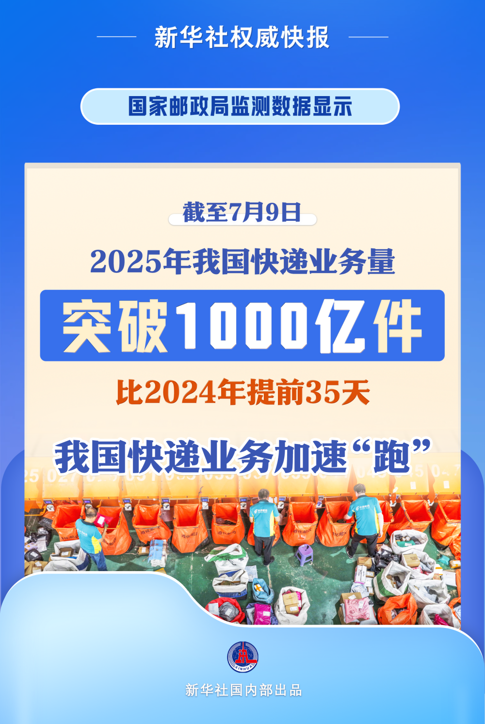 國(guó)家郵政局監(jiān)測(cè)數(shù)據(jù)顯示,截至7月9日,今年我國(guó)快遞業(yè)務(wù)量突破1000億件,比2024年提前35天。