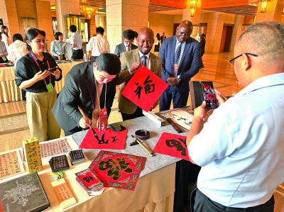 與會外國嘉賓在會議間隙體驗(yàn)寫福字。光明日報記者 楊逸夫攝/光明圖片