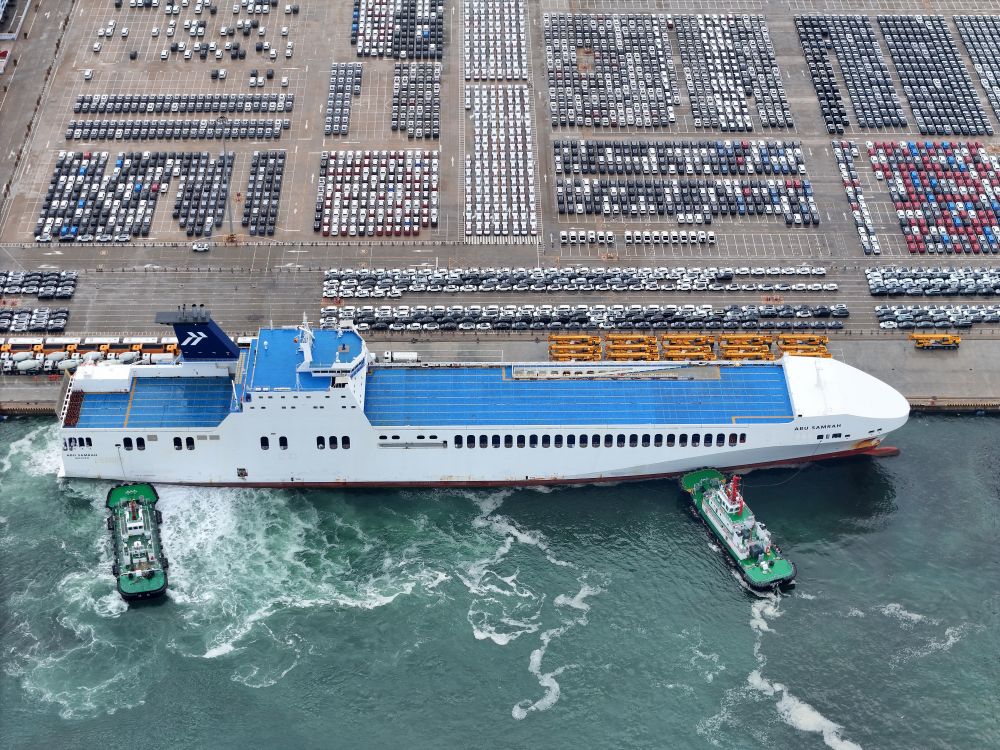 6月29日,汽車運(yùn)輸船??可綎|港口煙臺(tái)港,準(zhǔn)備裝運(yùn)出口汽車(無人機(jī)照片)。新華社發(fā)(唐克 攝)