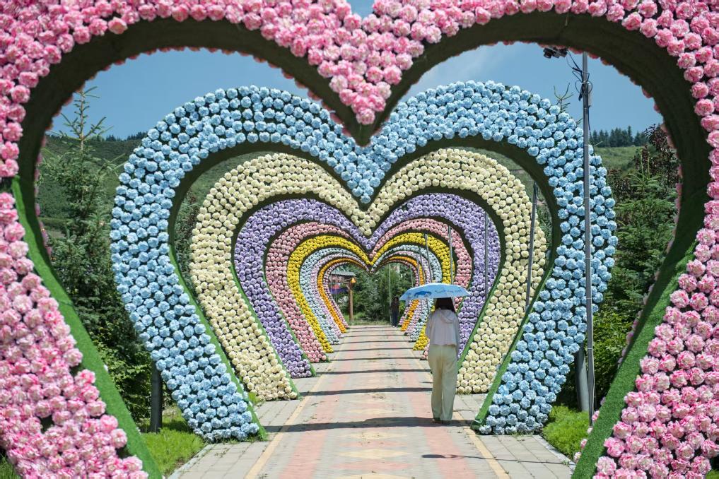 7月22日,在青海省大通縣邊麻溝花海景區(qū),一名游客經過鮮花長廊。新華社記者 孫瑞博 攝