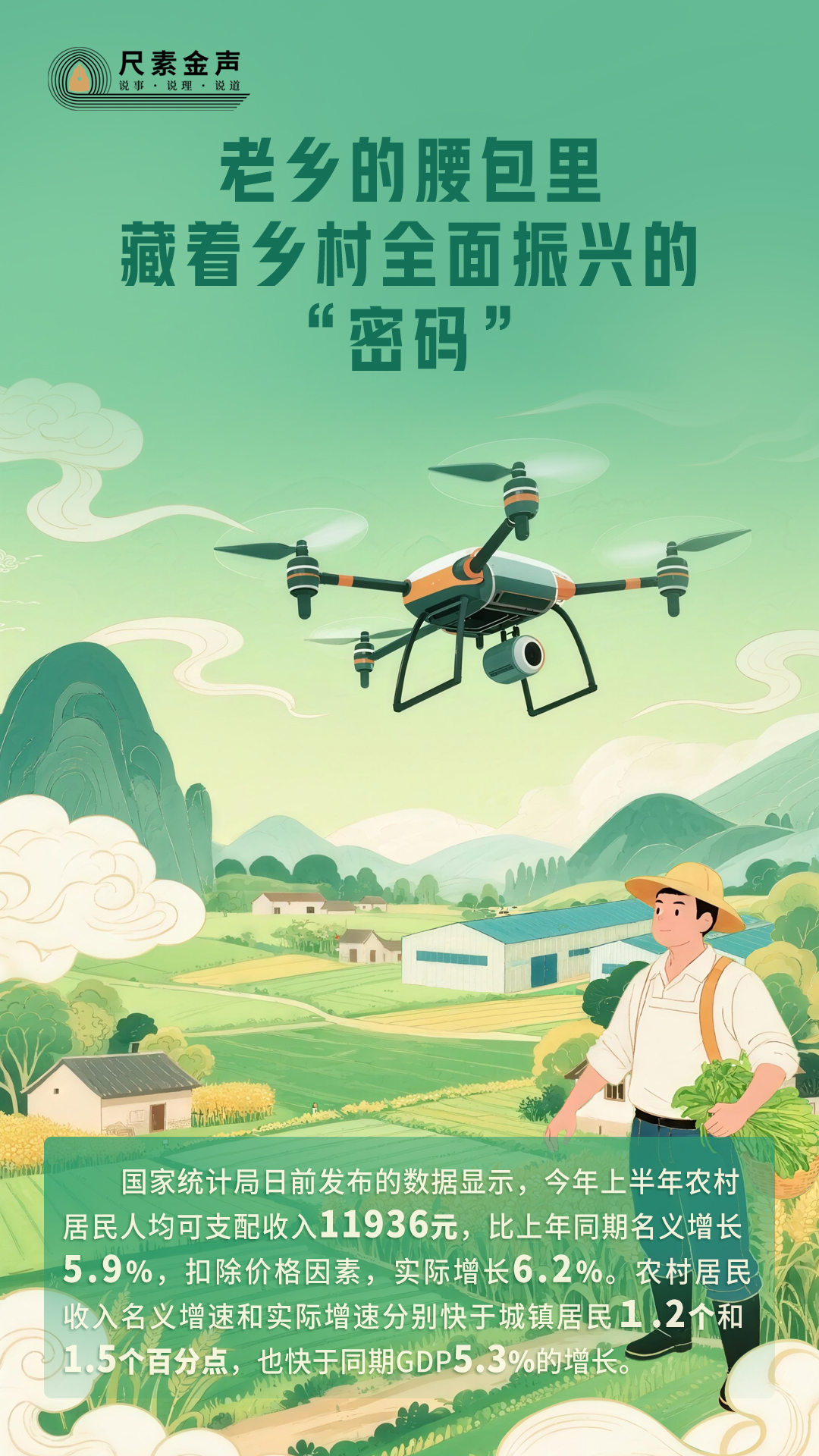 國(guó)家統(tǒng)計(jì)局日前發(fā)布的數(shù)據(jù)顯示,今年上半年農(nóng)村居民人均可支配收入11936元,比上年同期名義增長(zhǎng)5.9%,扣除價(jià)格因素,實(shí)際增長(zhǎng)6.2%。農(nóng)村居民收入名義增速和實(shí)際增速分別快于城鎮(zhèn)居民1.2個(gè)和1.5個(gè)百分點(diǎn),也快于同期GDP5.3%的增長(zhǎng)。