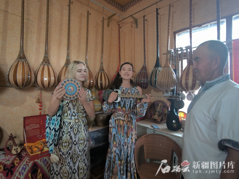 7月28日,在新和縣依其艾日克鎮(zhèn)加依村,俄羅斯籍網(wǎng)絡(luò)達(dá)人梅麗莎(左)和網(wǎng)絡(luò)名人古麗皮亞·買買提依明(中)正在體驗民間手工樂器。石榴云/新疆日報記者 甘興華攝