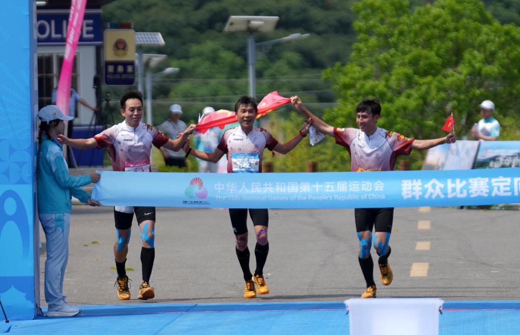 5月8日,廣東隊(duì)選手李卓業(yè)(中)、唐建達(dá)(左)、唐瀟在男子定向接力賽中沖向終點(diǎn)。當(dāng)日,第十五屆全國(guó)運(yùn)動(dòng)會(huì)群眾賽事活動(dòng)定向接力賽決賽在廣東省茂名市高州根子鎮(zhèn)舉行。新華社記者 黃國(guó)保 攝