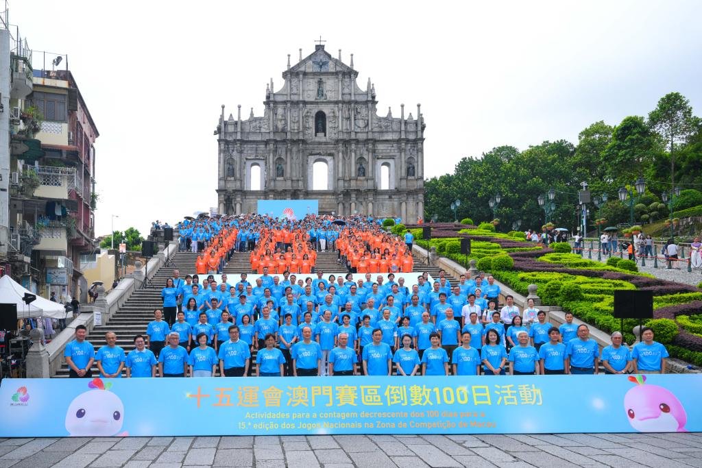 這是8月1日在澳門(mén)拍攝的第十五屆全國(guó)運(yùn)動(dòng)會(huì)倒計(jì)時(shí)100天慶?;顒?dòng)現(xiàn)場(chǎng)。新華社發(fā)(張金加攝)