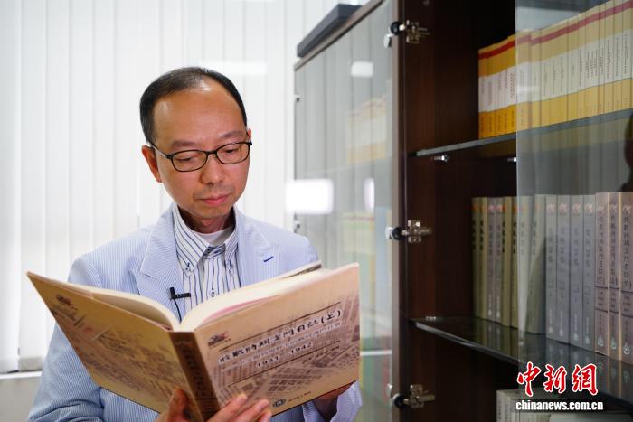 7月24日,澳門理工大學(xué)人文及社會科學(xué)學(xué)院院長、澳門口述歷史協(xié)會會長林發(fā)欽翻閱《抗戰(zhàn)時(shí)期澳門日志(上)》?!≈行律缬浾?鄭嘉偉 攝