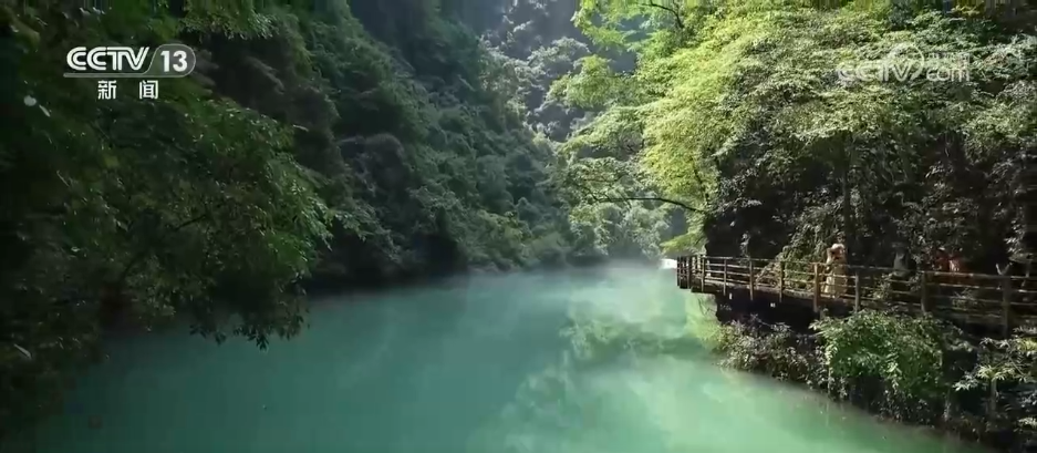 在大峽谷谷底,形態(tài)各異的峰林與緩緩流淌的溪水構(gòu)成了天然畫卷,陣陣微涼的山風(fēng)吹來,游客們仿佛漫步在原始森林中,在喧囂的夏天中感受到了一份難得的靜謐和涼爽。