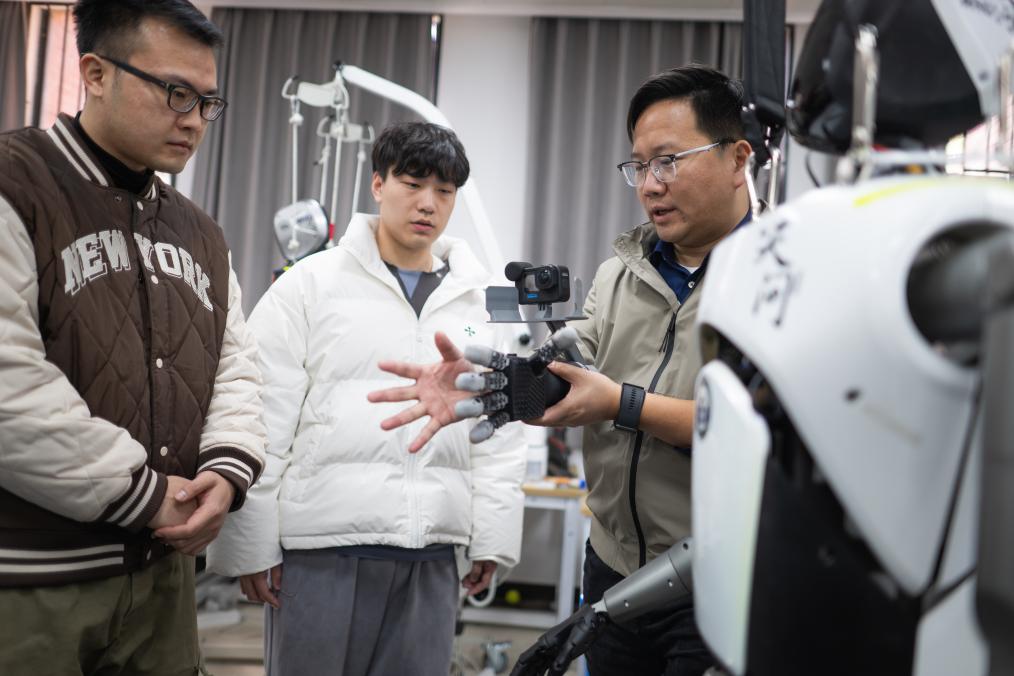 武漢大學(xué)研發(fā)團隊在對“天問”人形機器人進行調(diào)試。新華社記者肖藝九 攝