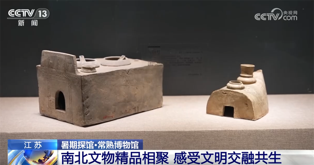 再來看這兩件展品,它們都是灰陶灶,是明器的一種,而且都是一孔灶,但是出土于北方和南方的灰陶灶明顯在風格上是不一樣的,北方的更為方正,而南方的這個船型灶也是屬于江南地區(qū)特有的灰陶灶。