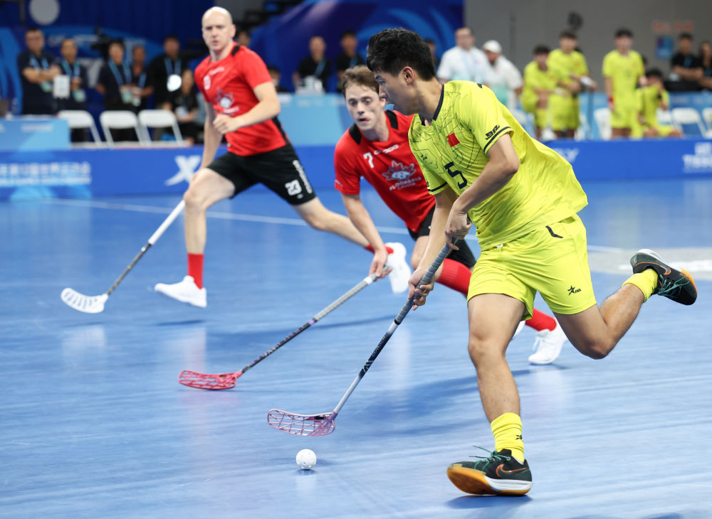 8月10日,中國隊球員張志恒(前)在比賽中帶球進攻。當日,在2025年成都世運會軟式曲棍球男子B組預賽中,中國隊不敵加拿大隊。新華社記者 梁旭 攝