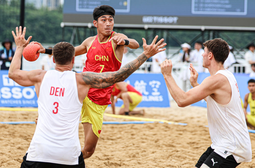 8月11日,中國隊球員任健豪(上)在比賽中進攻。當日,在2025年成都世運會沙灘手球男子第5-8名安慰賽半決賽中,中國隊0比2不敵丹麥隊。新華社記者 劉坤 攝