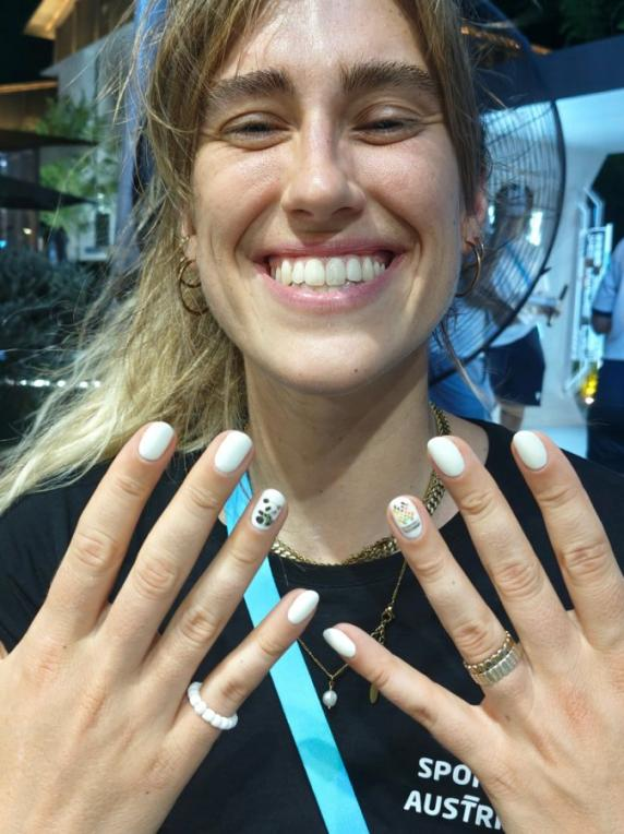 澳大利亞姑娘向記者展示美甲機器人噴繪的熊貓圖案