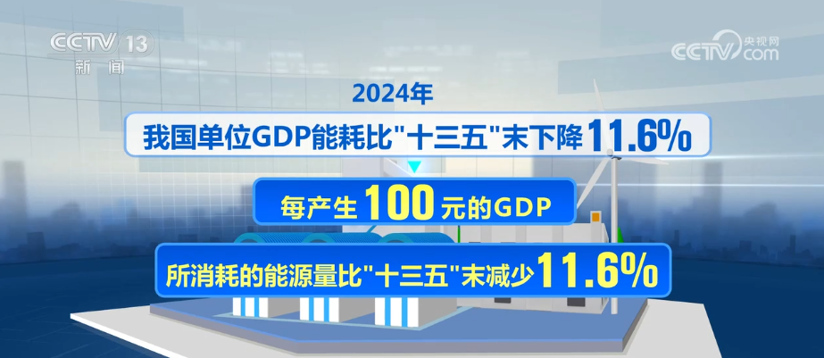 2024年,我國單位GDP能耗比“十三五”末下降11.6%。也就是說每產(chǎn)生100元的GDP,所消耗的能源量比“十三五”末減少了11.6%,能耗下降的同時,另一個指標的水平卻提高了——主要資源產(chǎn)出率卻提高了12%。